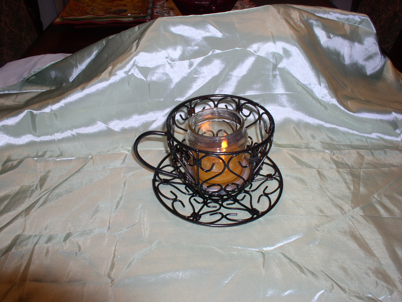 This metal tea cup and saucer was an ugly ivory when I purchased it. I spray painted it with my beloved rubbed oil bronze. It really made a difference. It is fairly large I have a medium size candle inside the cup.